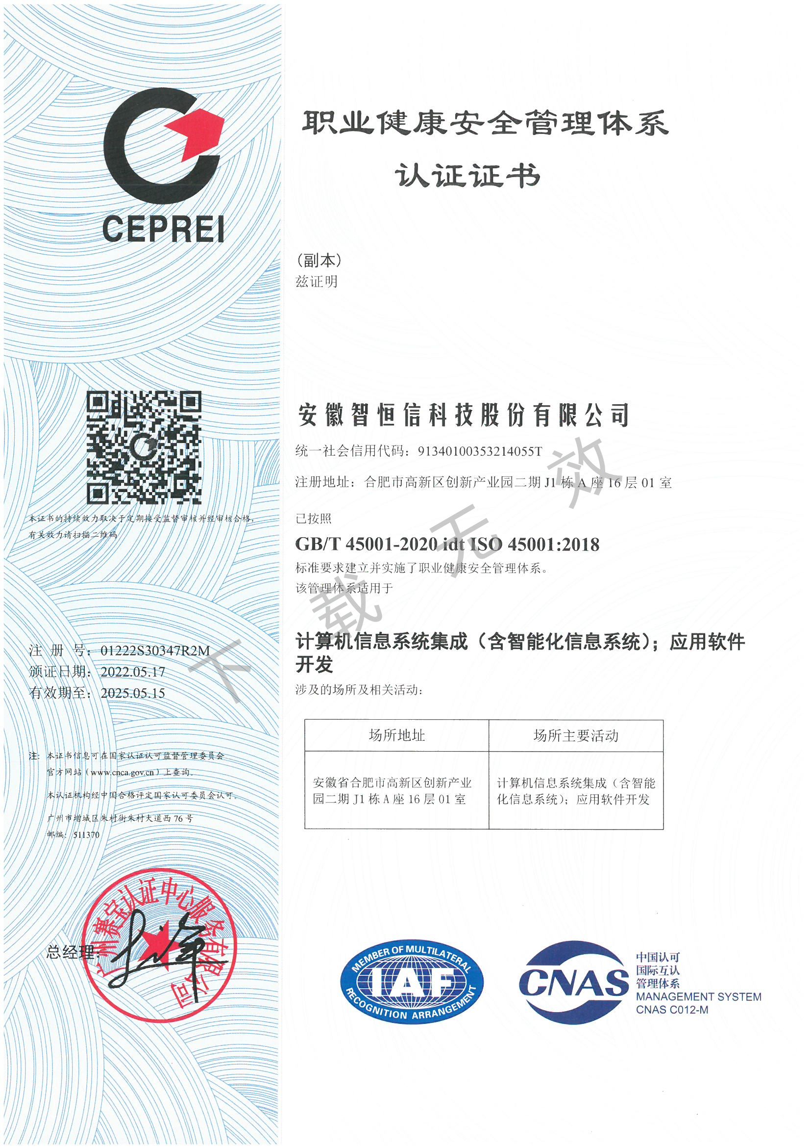 职业健康管理认证证书